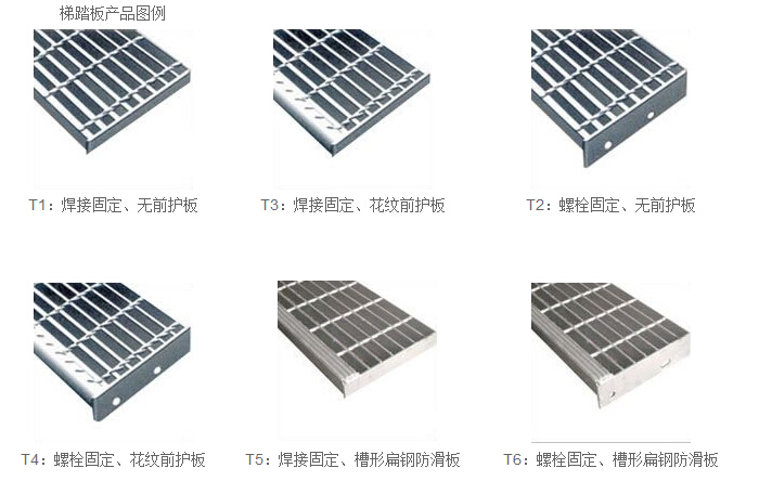 ◆ 我公司生產(chǎn)的踏步板根據(jù)有無前護板和與梯梁聯(lián)接方式有四種形式,表示為T1,T2,T3,T4。
